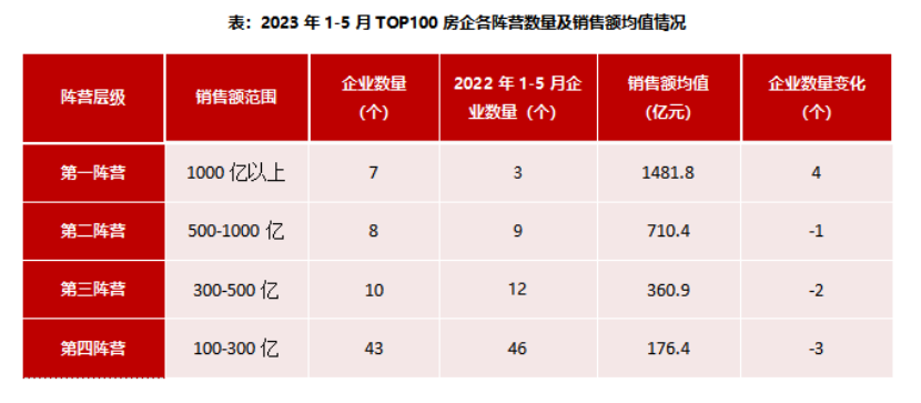 同時(shí),1-5月,千億以上陣營企業(yè)數(shù)量增加。具體來看,千億以上陣營7家,較去年同期增加4家,銷售額均值1481.8億元。第二陣營(500-1000億元)企業(yè)8家,較去年同期減少1家,銷售額均值710.4億元。第三陣營(300-500億元)企業(yè)10家,較去年同期減少2家,銷售額均值360.9億元。第四陣營(100-300億元)企業(yè)為43家,較去年同期減少3家,銷售額均值176.4億元。