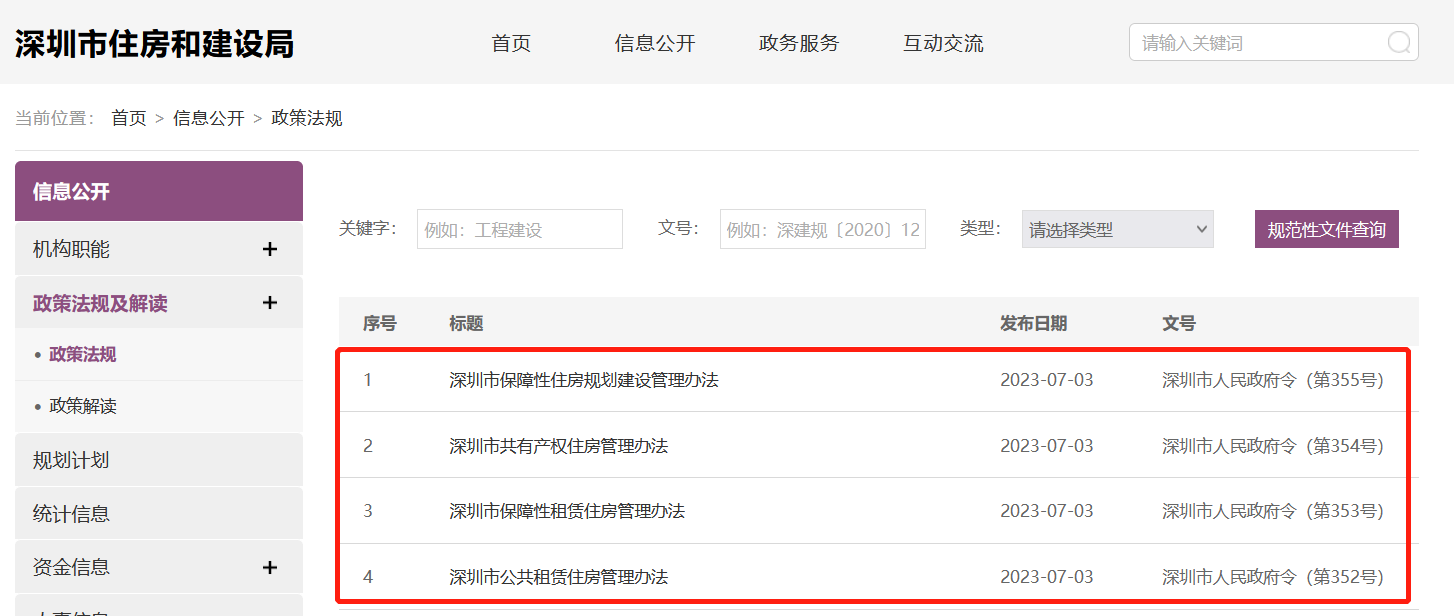 央廣網(wǎng)北京7月5日消息 據(jù)深圳市住房和建設(shè)局網(wǎng)站消息,7月3日,深圳市住建局發(fā)布《深圳市公共租賃住房管理辦法》《深圳市保障性租賃住房管理辦法》《深圳市共有產(chǎn)權(quán)住房管理辦法》《深圳市保障性住房規(guī)劃建設(shè)管理辦法》,具體來看,上述四項管理辦法,分別對公共租賃住房、共有產(chǎn)權(quán)住房、保障性租賃住房等三類住房的保障對象、申請條件、供應(yīng)分配方式、租售價格標(biāo)準(zhǔn)、用地保障、建設(shè)籌集主體和渠道、建設(shè)標(biāo)準(zhǔn)、監(jiān)督管理等進行了規(guī)范。四項管理辦法將于8月1日正式實施。