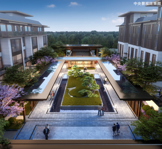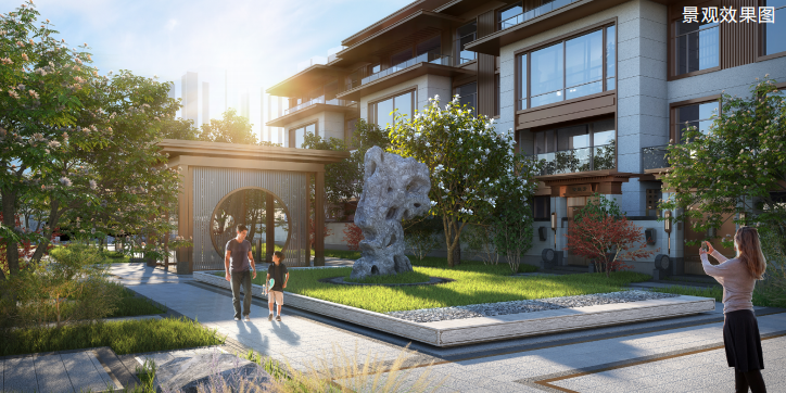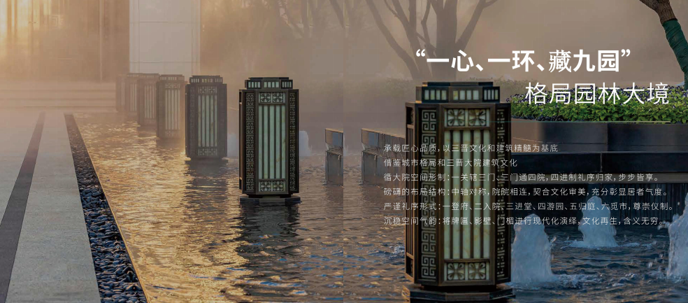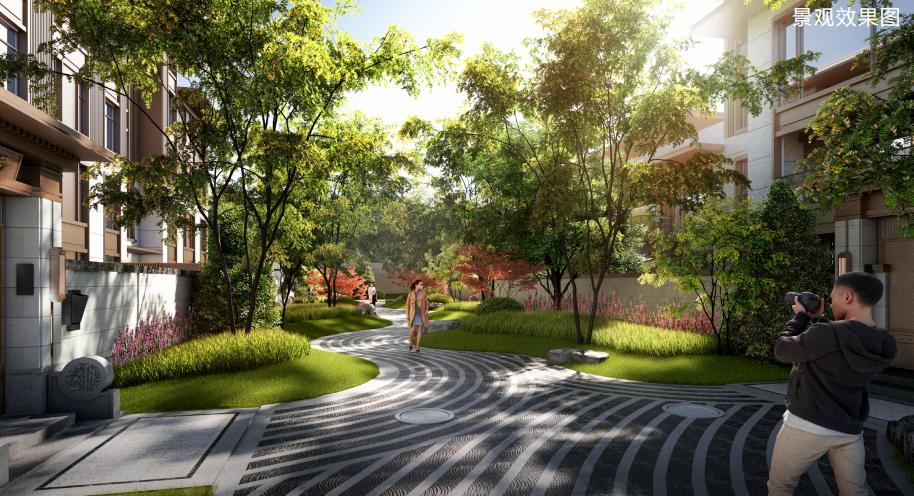 項目整體景觀設計以山林水源,禪意大宅為主線,將江南園林與皇家園林相結合,形成前府后院的園林形態(tài),景觀采用四級九景,四重栽植造園手法,點綴了九個院落四十個景點。園林鋪裝精致而具有設計感,在細節(jié)中加入特有的重視吉祥紋樣,更突出了新中式園林的設計風格。