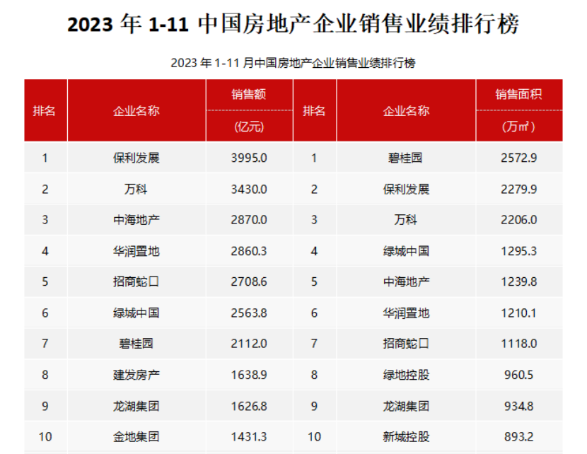從企業(yè)表現來看,央國企銷售表現仍較為強勁。2023年1-11月,銷售額同比增長超過10%的大型企業(yè)為,中海、華潤、建發(fā)、越秀、華發(fā)、聯(lián)發(fā)、國貿地產、中建壹品、中建東孚、象嶼地產等,這些企業(yè)銷售增長較為強勁。