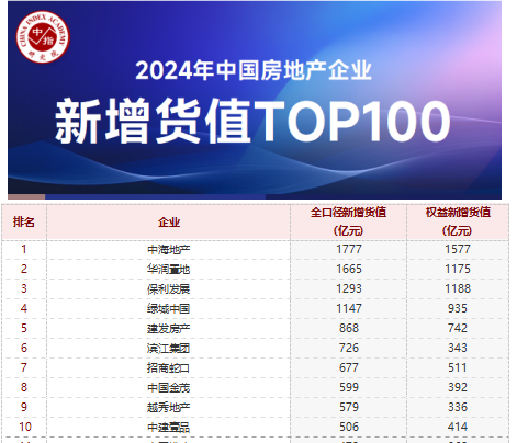 中海地產(chǎn)、華潤(rùn)置地位列新增貨值前二