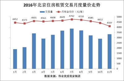 按照慣例,10月之后北京租賃市場進(jìn)入傳統(tǒng)淡季,剛剛過去的11月,北京月租金均價(jià)創(chuàng)年內(nèi)新低。據(jù)偉業(yè)我愛我家集團(tuán)市場研究院統(tǒng)計(jì),2016年11月,北京區(qū)域通過我愛我家達(dá)成的住宅租賃交易量環(huán)比10月同期上漲14.8%,但月租金均價(jià)為4107元/平米,環(huán)比10月下跌6.9%。