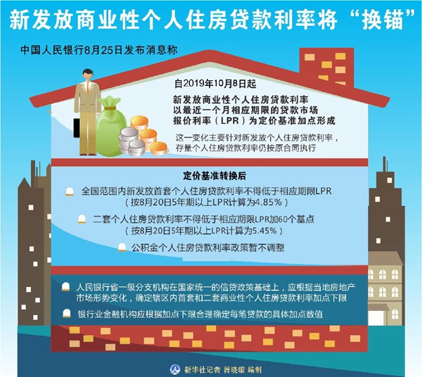 新華社北京8月25日電(記者張千千)中國人民銀行25日發(fā)布消息稱,自今年10月8日起,新發(fā)放商業(yè)性個(gè)人住房貸款利率以最近一個(gè)月相應(yīng)期限的貸款市場報(bào)價(jià)利率(LPR)為定價(jià)基準(zhǔn)加點(diǎn)形成。這一變化主要針對新發(fā)放個(gè)人住房貸款利率,存量個(gè)人住房貸款利率仍按原合同執(zhí)行。