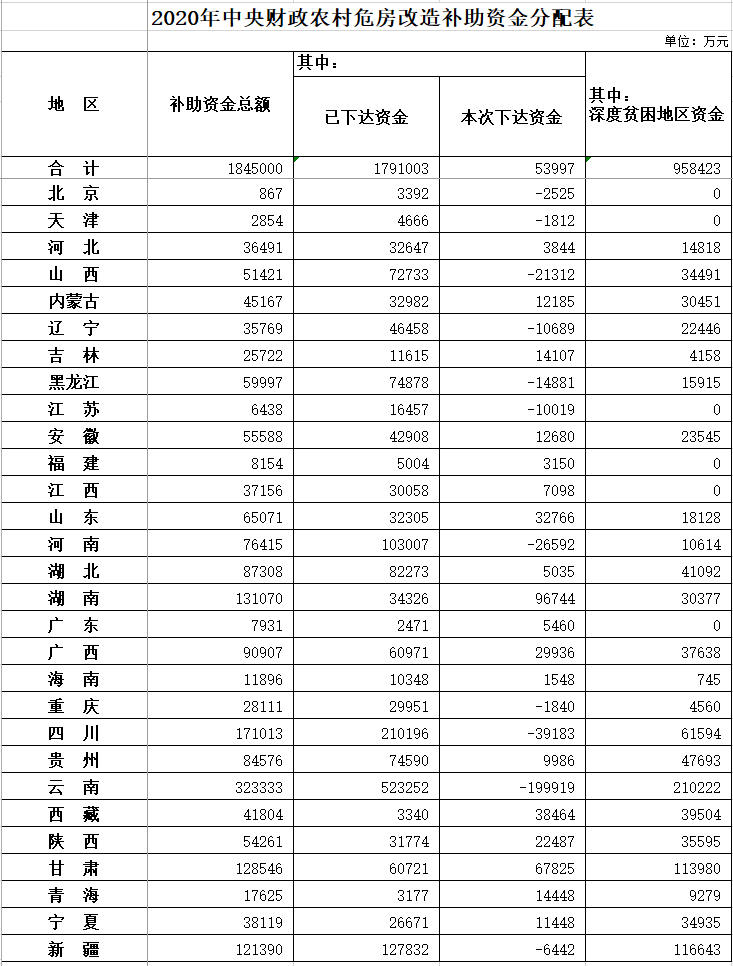 人民網北京6月18日電(記者孫紅麗) 近日,財政部、住房城鄉(xiāng)建設部聯(lián)合發(fā)布《關于下達2020年中央財政農村危房改造補助資金預算的通知》?!锻ㄖ凤@示,29個省份補助資金總額為184.5億元。