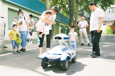 7月21日,智能機器人在山東省濟南市樂山小區(qū)巡邏。它能監(jiān)控小區(qū)噪音、火災和違章停車等警情并向社區(qū)民警傳送信息。郝鑫城攝(人民視覺)