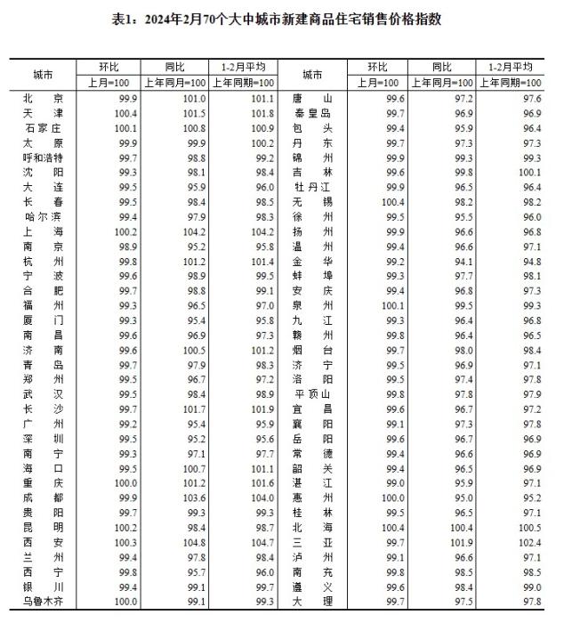 2024年2月70個大中城市新建商品住宅銷售價格指數(shù)。 截圖自國家統(tǒng)計局官網