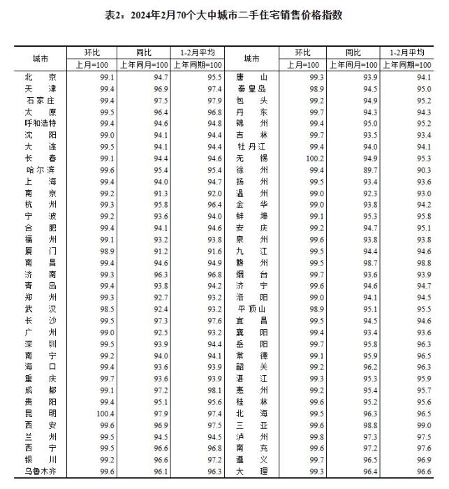 2024年2月70個大中城市二手住宅銷售價格指數(shù)。 截圖自國家統(tǒng)計局官網