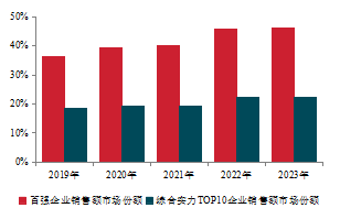 報(bào)告顯示,2023年,百?gòu)?qiáng)企業(yè)銷售總額、銷售面積分別達(dá)53896.0億元、26131.6萬(wàn)平方米。 百?gòu)?qiáng)企業(yè)市場(chǎng)份額為46.2%,較上年微增0.4個(gè)百分點(diǎn)。