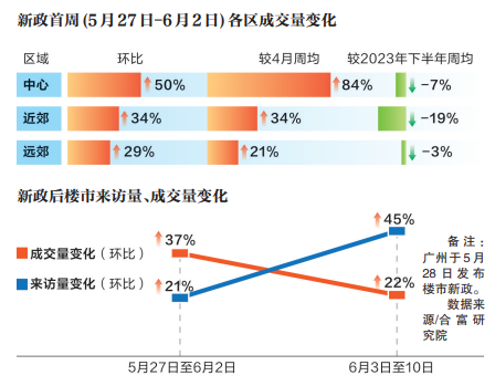 廣州“5·28”新政后,市場反應(yīng)確實很積極。據(jù)合富研究院監(jiān)測,“5·28”新政落地,連續(xù)政策利好刺激下全市成交(基于認購數(shù)據(jù))階梯式上漲。5月27日至6月2日,來訪、成交環(huán)比分別上升21%、37%。各區(qū)域成交熱度均有改善,中心區(qū)域成交環(huán)比上升50%,多個熱盤如天河區(qū)越秀·觀樾,海珠區(qū)保利燕語堂悅、琶洲南TOD,荔灣區(qū)保利和頌等單周成交超20套。近郊、遠郊成交環(huán)比分別上升34%及29%。此外,6月3日至10日,廣州樓市熱度持續(xù)活躍,來訪量比前一周上漲45%,成交量(基于認購規(guī)模統(tǒng)計)環(huán)比上升22%;近郊黃埔、番禺來訪人氣環(huán)比均有不同程度上升,成交量比前一周上漲27%。