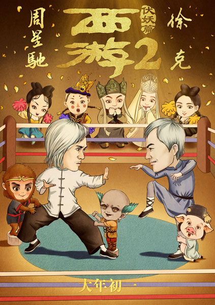 此外,隨預告片一同發(fā)布的“對壘版”漫畫海報也非常逗趣:周星馳與徐克兩人化身武林高手的漫畫形象在擂臺上展開對壘。周星馳太極拳的姿勢與影片《功夫》中阿星的形象極為相似,徐克的招式動作也很有黃飛鴻的架勢。而化身為Q版造型的師徒四人則為擂臺上的兩人按摩捶腿、加油助威,充滿童趣。