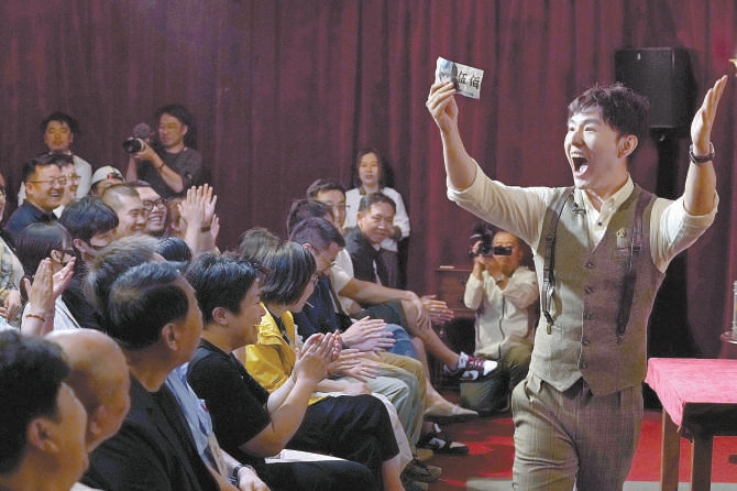 “各位哥哥、姐姐,還有大姨、二舅、四叔,都來啦!”魔術師鄧男子站在離觀眾不到1米遠的地方,熱情地和大家打著招呼,溫暖親切的氣氛油然而生。自5月18日起至6月30日,由北京天橋藝術中心、長沙椰果文化傳媒出品的魔術脫口秀《男巫客廳》在天橋藝術中心新空間劇場駐演。這部作品以驚奇的魔術戲法、無處不在的笑點和滿滿的體驗感打動觀眾,也為北京演藝新空間的探索邁出了堅實的一步。