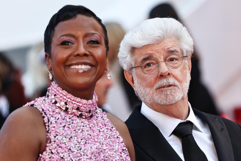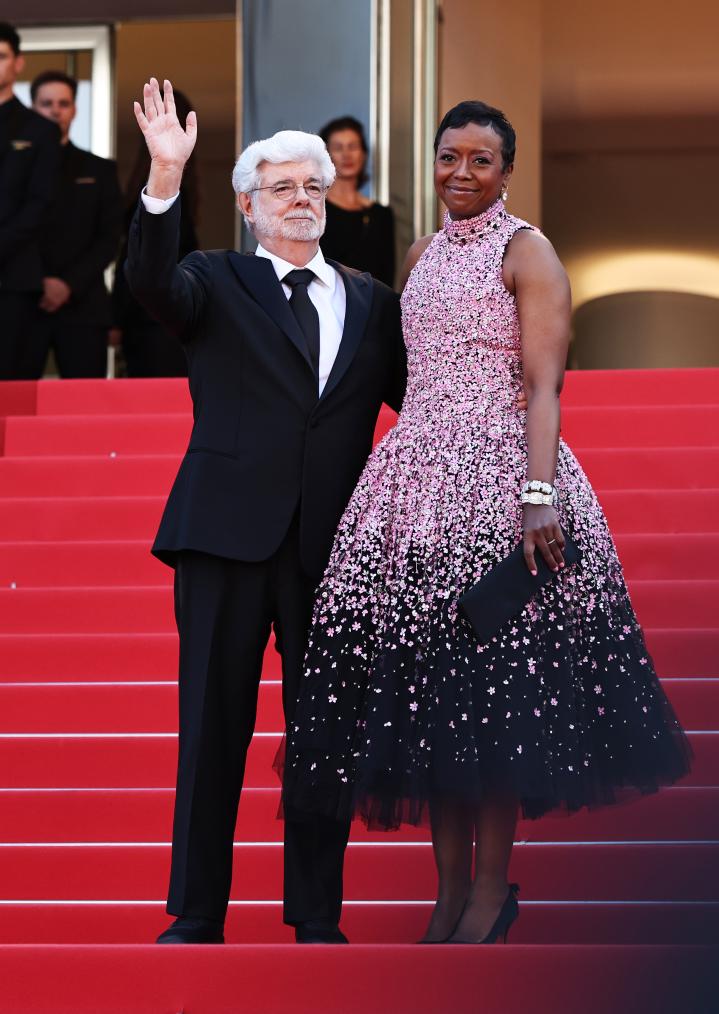 5月25日,在法國南部城市戛納舉行的第77屆戛納電影節(jié)上,美國導(dǎo)演、編劇、制片人喬治·盧卡斯(左)抵達閉幕式紅毯。新華社記者 高靜 攝