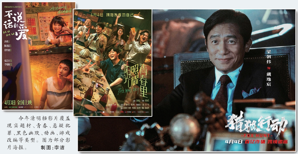 今年清明檔影片覆蓋現(xiàn)實題材、青春、懸疑犯罪、黑色幽默、動畫、游戲改編等類型。圖為部分影片海報。 制圖:李潔