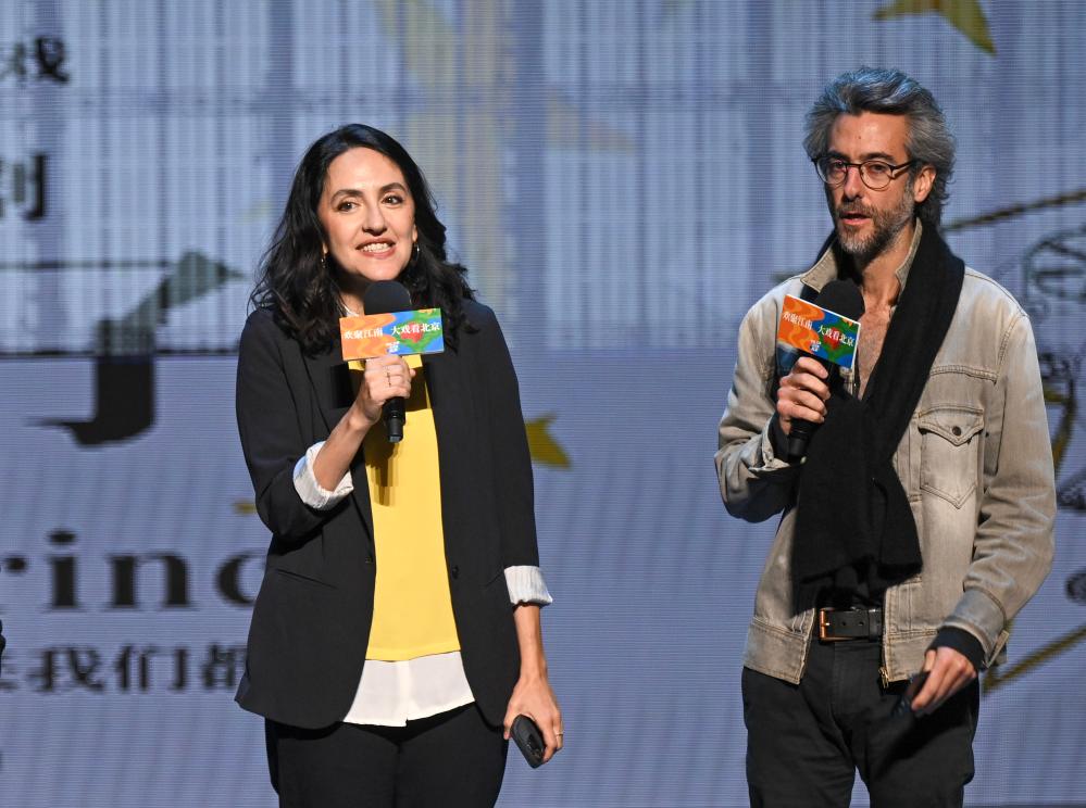 10月12日,在位于北京的中央歌劇院劇場,音樂戲劇《小王子》導(dǎo)演讓·貝洛里尼(右)、總制作人安娜出席發(fā)布會。新華社記者 金良快 攝