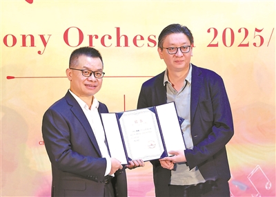 中國(guó)交響樂(lè)團(tuán)黨委書(shū)記周宇(左)為著名小提琴家陸威頒發(fā)客座首席聘書(shū)。攝影/羅維