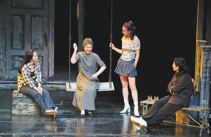 北京人藝話(huà)劇《小郡之秋》劇照,龔麗君飾演的母親(左二)與陳小藝(右一)、張培(左一)、原雨(右二)飾演的三個(gè)女兒在一起。記者 方非攝