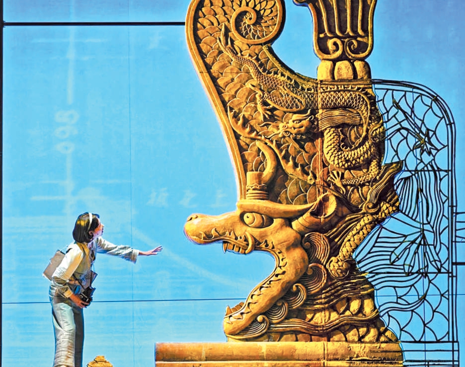 王琛透露,舞臺上關(guān)鍵的古建筑構(gòu)件均嚴格按照1∶1的真實比例復原制作,當它們懸置于觀眾面前,一種視覺上的“沖擊力”油然而生,“觀眾能直觀體會到劇中人物每日工作的物理尺度和精神重量,體會測繪隊員是以怎樣的血肉之軀攀爬、丈量并挽留這份巍峨的文明?!蔽枧_地面,北平時期中軸線的建筑脈絡(luò)化為起伏線條,如紙張般弧形掀起,“寓意著古城文明在戰(zhàn)火中飄搖欲飛卻又根基深植的命運。建筑的‘實’代表文明遺產(chǎn),圖紙的‘虛’代表傳承意志,虛實明暗的銜接過渡,共同凝固了那段驚心動魄的歷史?!保ㄓ浾?高倩)