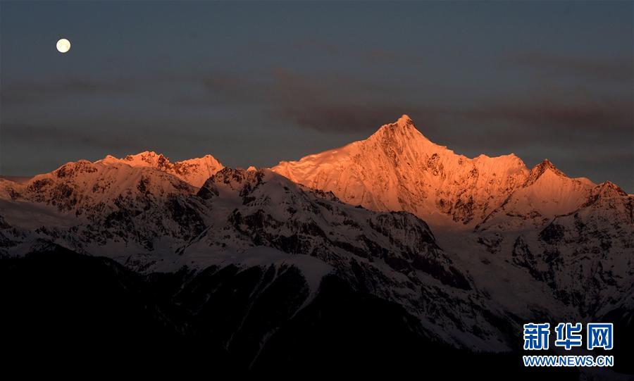 這是3月25日清晨拍攝的梅里雪山“日月同輝”景觀。梅里雪山位于滇藏交界的云南省迪慶藏族自治州德欽縣境內,是世界自然遺產“三江并流”的主要自然景觀之一。梅里雪山常年云霧籠罩,太陽光只在少數天晴的清晨照射在雪山頂上,形成絕美的“日照金山”美景。有時月亮尚未落山,太陽已經升起,更是形成了難得一見的梅里雪山“日月同輝”奇觀。新華社記者 王長山 攝