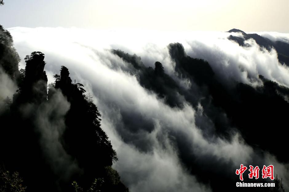 4月18日,雨過天晴的湖南張家界核心景區(qū)武陵源出現(xiàn)壯觀的“云瀑”景觀。雪白的濃云從峰林間向下翻騰,猶如天河傾瀉,氣勢磅礴。 吳勇兵 攝