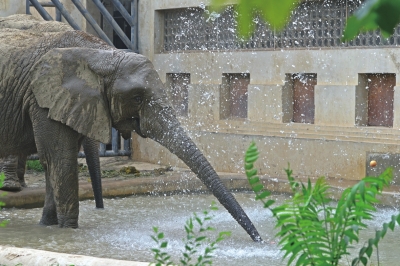 在大象展區(qū),寬敞的運(yùn)動(dòng)場(chǎng)地上,淋浴噴頭頗為顯眼,下方還有一個(gè)半米多深的水池,天氣熱的時(shí)候,大象可以邊淋浴邊戲水,時(shí)不時(shí)甩開(kāi)長(zhǎng)鼻子吸起水來(lái)為自己沖涼。運(yùn)動(dòng)場(chǎng)上還有兩個(gè)七八米高的草棚,沖完涼的大象可以躺在下面乘涼休息。