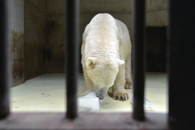 這時(shí),飼養(yǎng)員向北極熊的“客廳”投進(jìn)去兩大塊冷凍冰塊,不一會(huì)兒,一只胖胖的北極熊挪動(dòng)著龐大的身軀慢慢地從自己“臥室”走出來(lái),雙手抱起冰塊,放在嘴邊啃起來(lái)。