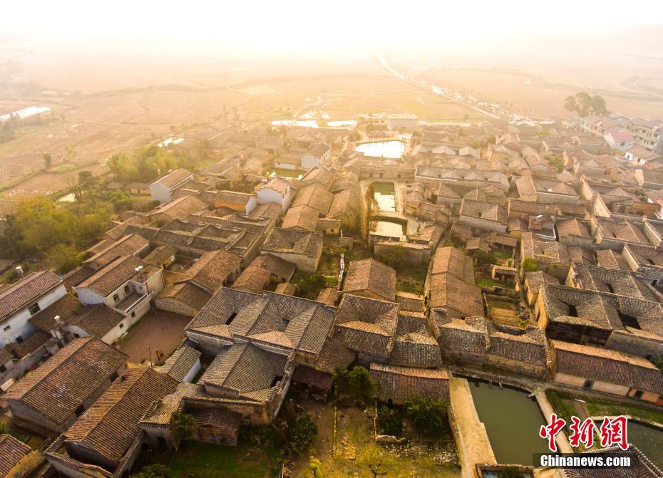 12月10日,航拍位于江西金溪縣有著600多年歷史的中國歷史文化名村、中國傳統(tǒng)村落竹橋古村,俯瞰全村,形似一柄巨扇。該村現保存有明代所建民居8幢,明代祠堂1幢,其余為清代建筑,青磚灰瓦,樸實素雅,為贛派建筑最典型的代表。村前溪水長流,良田萬頃,村后茂林修竹,鳥鳴樹幽,身歷其境,如入畫中。傅建斌 攝