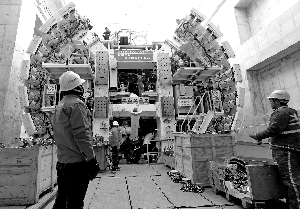 北京晨報(bào)記者在現(xiàn)場看到,各種吊車、大型作業(yè)機(jī)器正在緊張作業(yè)中。記者走到隧道“洞口”處看到, 腳下一臺(tái)巨型的盾構(gòu)機(jī)呈現(xiàn)在眼前,由于隧道采用明挖法、暗挖法、盾構(gòu)法相結(jié)合的施工作業(yè)方法,據(jù)記者目測(cè),從盾構(gòu)機(jī)最底端到記者所在的地面約有七八層樓高。幾十名施工人員正冒著寒風(fēng)對(duì)盾構(gòu)機(jī)進(jìn)行組裝、吊裝。北京晨報(bào)記者了解到,這臺(tái)巨型盾構(gòu)機(jī)直徑達(dá)11米左右。