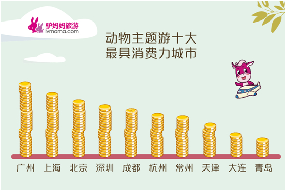 哪些地方的游客在動物主題游上最舍得花錢?數(shù)據(jù)顯示,動物主題游消費(fèi)總額前10的出發(fā)地城市分別為:廣州、上海、北京、深圳、成都、杭州、南京、天津、大連、青島。