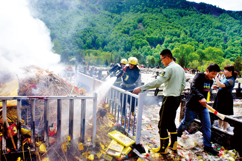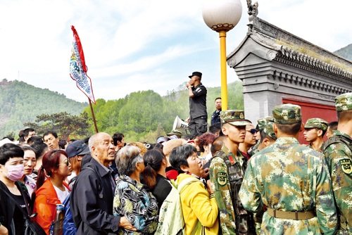 19日上午,中心區(qū)旅游人數(shù)達(dá)到峰值,五爺廟前的廣場是安保壓力最大的區(qū)域,按照活動(dòng)《方案》建立了兩道隔離帶,公安民警、武警、消防、保安緊密協(xié)作,分兵把守,有序放行。在五爺廟前的焚香區(qū),武警戰(zhàn)士組成人墻迎接一浪高過一浪的人潮沖擊,確保了萬千游客的絕對安全,豆大的汗珠順著他們的臉頰不斷流淌。