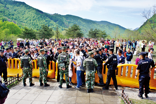 5月18日深夜,隨著三個(gè)入山口人流的驟增,原定22時(shí)30分上崗的民警提前到20時(shí)全部到位。23時(shí)40分,記者來到南線游客中心,只見潮水般的人群涌向售票大廳,不少公安民警在安監(jiān)門口嚴(yán)密把守,有序放行,站在臺階上的民警手舉超大口徑的大喇叭向嘈雜擁擠的人海不斷地呼喊:“不要擁擠,有序排隊(duì)!”在游客中心東邊的交通要道上,全副武裝的交通民警正在緊張地疏導(dǎo)川流不息的車輛。19日1時(shí)燈光下,記者看到擔(dān)任此次安??傊笓]的市公安局局長楊梅喜在寒風(fēng)中與民警一道指揮交通。
