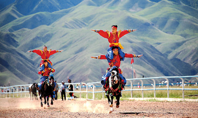 甘肅省肅南縣搶抓“一帶一路”機(jī)遇,打造全域旅游“自然生態(tài)博物館”,進(jìn)一步弘揚(yáng)民族傳統(tǒng)文化,展示當(dāng)?shù)貪庥舻拿褡屣L(fēng)情和獨(dú)特的自然景觀,促進(jìn)當(dāng)?shù)芈糜挝幕w育融合發(fā)展。圖為賽馬選手在肅南縣日前舉辦的索朗格國際賽馬場進(jìn)行馬術(shù)表演。
