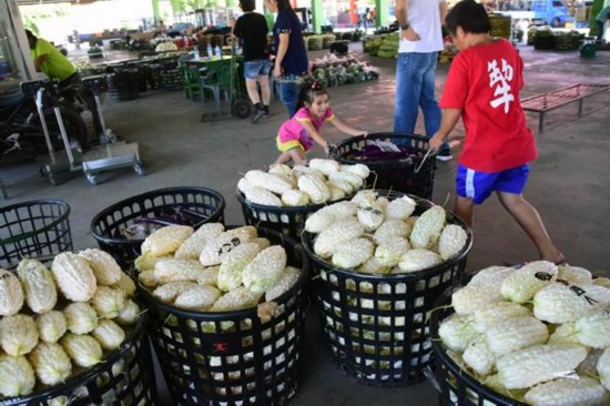 臺(tái)東在地苦瓜、絲瓜滯銷(xiāo),價(jià)格下跌,在果菜市場(chǎng)幫忙的小朋友,請(qǐng)大家多采購(gòu)好吃又便宜的苦瓜。(圖片來(lái)源:臺(tái)灣《中時(shí)電子報(bào)》)