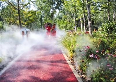 昨(3號(hào))日,安德城市森林公園內(nèi)設(shè)置多處噴霧裝置。記者 王貴彬 攝
