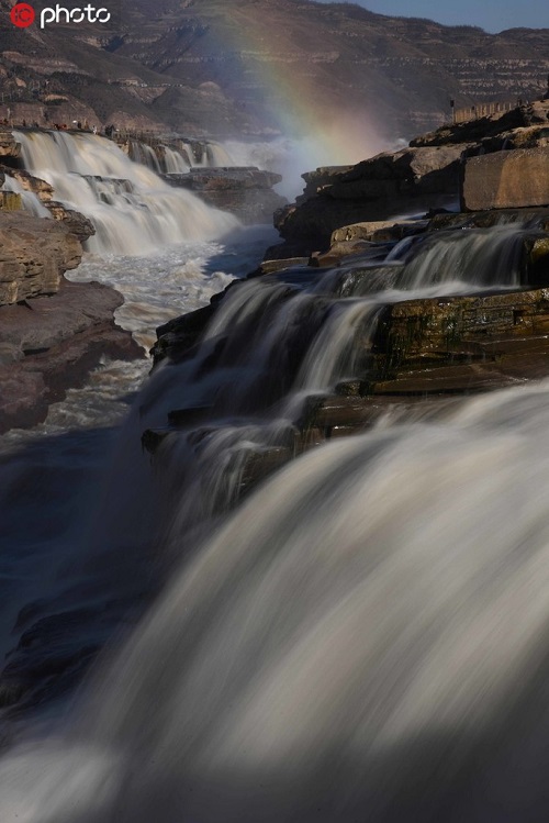 2019年11月25日,山西吉縣黃河壺口瀑布出現(xiàn)“彩虹通天”美景。入冬以來,隨著黃河干流水位回落,壺口瀑布落差加大,滾滾河水翻滾而下,飛濺起30多米高的水霧,在陽光的照射下,形成“彩虹通天”的美麗景象,讓游客流連忘返。呂桂明/攝