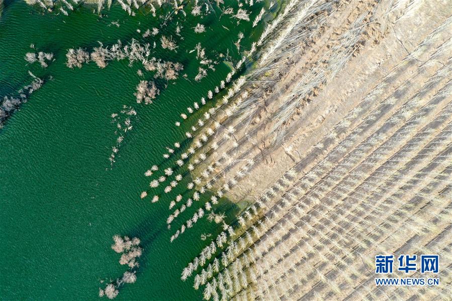 這是4月19日拍攝的阿勒泰市中水庫一角(無人機照片)。近年來,新疆阿勒泰市利用經(jīng)污水處理廠處理達標后的中水,灌溉建在戈壁灘上的苗圃基地,形成良性循環(huán),助力綠化工程,改善生態(tài)環(huán)境。從2017年至今,阿勒泰市中水回用環(huán)境治理示范園已為當?shù)鼐G化工程提供40萬株樹苗,實現(xiàn)5000畝荒山綠化。 新華社記者 丁磊 攝