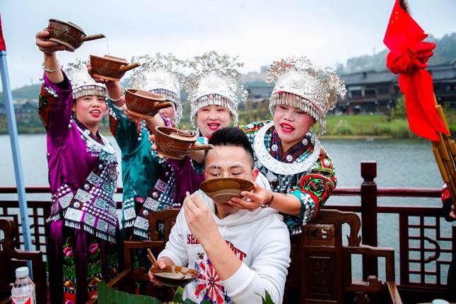 配合著各類美食,苗家春宴里不僅有十八道“攔門酒”、“高山流水”等花式敬酒,還有廣場迎賓舞、苗族八大支系盛裝巡游等多項(xiàng)苗、侗等少數(shù)民族的特色活動。其中最值得一提的,便是宴席開始前丹寨錦雞舞的表演,在苗族傳統(tǒng)蘆笙伴奏下,身著銀角冠服飾的苗族姑娘如錦雞般翩翩起舞,銀飾躍躍欲飛,銀角冠一點(diǎn)一搖,腿邊花帶一飄一閃,舞者步履輕盈,悠然搖擺,歡樂的氣氛讓人胃口大開。