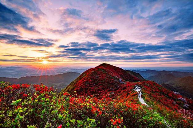 同樣選擇在薄霧初上的黎明出發(fā),順著龍泉山蜿蜒的石板路拾階而上,途徑一座古樸典雅的半山?jīng)鐾さ诌_(dá)山頂,眼前的奇觀如畫卷般徐徐展開:這是一片壯闊的云海,幾處鮮艷的杜鵑花叢在云霞中若隱若現(xiàn),云海下隱藏著一整片杜鵑花海,延綿好幾公里,將龍泉山脈裝點(diǎn)得一派火紅,日出時東方天際噴涌而出的紅霞映照著云海杜鵑,仿佛給空氣鑲上了紅色濾鏡,一時間群山都變得奇幻瑰麗,這是丹寨龍泉山別具一格的云上杜鵑花?!坪2幌∑?,花海也常有,云上花海卻是大多數(shù)人這輩子難得一見的奇觀,想親眼目睹嗎?