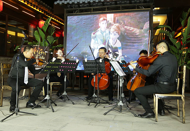 人民網(wǎng)忻州6月2日電(李夢文)6月1日晚8點30分,華燈璀璨的忻州秀容古城突然傳來一陣優(yōu)美的西洋音樂,街邊游客循著音樂聲聚集到河曲院落。《風中奇緣》《冰雪奇緣》《美女與野獸》《天空之城》《千與千尋》,隨著這一首首耳熟能詳?shù)臉非谝魳芳沂种辛魈识?,聽眾也越來越多,越來越激動?/p>