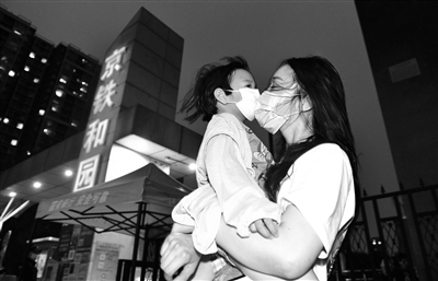 昨晚8點(diǎn)剛過(guò),京鐵和園小區(qū)已有居民走出小區(qū),前往附近的超市、公園。在小區(qū)門(mén)口,3歲的多多老遠(yuǎn)就看到門(mén)外的媽媽?zhuān)吲d壞了。多多的媽媽告訴北青報(bào)記者,孩子一直住在京鐵和園的奶奶家,社區(qū)封閉后,她只能晚上隔著大門(mén)看看孩子。聽(tīng)說(shuō)昨晚社區(qū)解除封閉,她特意趕過(guò)來(lái)想抱一抱多多。不過(guò),由于多多和奶奶的出入證正在辦理中,孩子還不能走出小區(qū)。在征得門(mén)口值守人員的同意后,多多跟媽媽終于在小區(qū)外重逢,母子倆擁抱在一起。