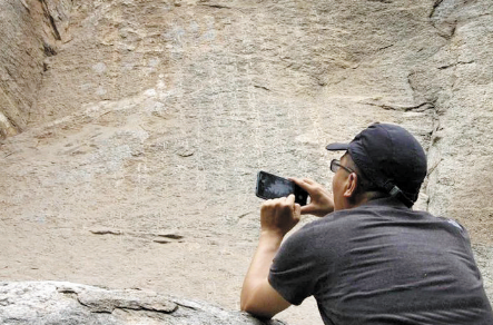 離開龍泉寺遺址,四人順著石階退下廟宇高臺,在王老師的引導下,尋找那片記憶中的摩崖石刻。終于在高臺東側約40米處的山體上,發(fā)現高懸兩米的摩崖石刻。一片巖壁上刻有國子監(jiān)生行書《龍泉寺記》。巖壁上鑿刻有一方石窟,石窟內供奉“龍王”,石窟外懸掛有當地村民來此求雨成功的錦旗。大家出于好奇,搭人梯攀巖,仔細辨認石刻字面,想看個究竟。整個石碑高不達3米,寬約2米,整體呈含胸內斂之勢,可蔽風雨侵蝕。卻因時年久遠,底部泥土沉淀遮擋,部分文字不可通讀。粗略判斷全文10列,每列32字,單字大小7厘米,共約300余字。