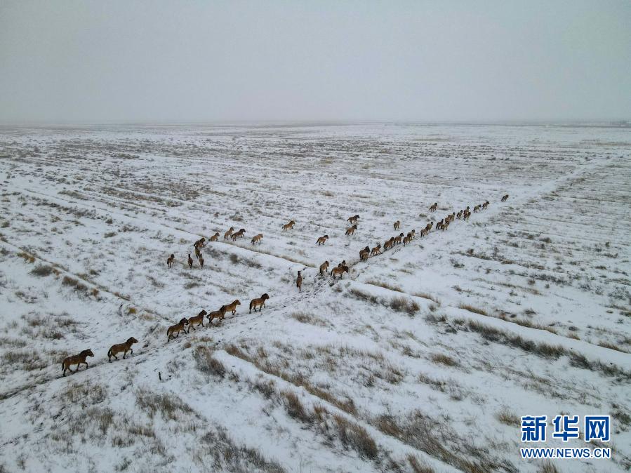 在新疆吉木薩爾縣境內(nèi)拍攝的普氏野馬(1月23日攝,無人機(jī)照片)。一場風(fēng)雪降臨,這里呈現(xiàn)出馬踏飛雪的冬日壯麗景象。