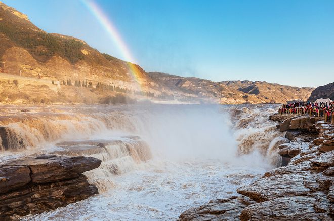 近日,受氣溫回暖影響,位于山西省吉縣和陜西省宜川縣交界處的黃河壺口瀑布冰消河開,再現(xiàn)奔騰咆哮的壯美景觀。受前一段時間凌汛影響,關(guān)閉了半個月的壺口瀑布景區(qū)于2月12日恢復(fù)對外開放。圖為2月12日,游客在山西吉縣黃河壺口瀑布游覽觀瀑(無人機照片)。