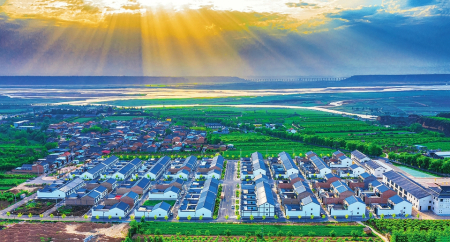 黃河萬(wàn)榮段河流與移民新村相映成畫(huà)。