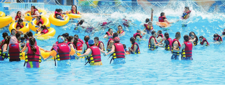 走進精衛(wèi)水世界,陽光、椰林、沙灘,以及南方綠色植物景觀和卡通造型,讓人仿佛置身空氣清新、陽光明媚的海邊城市。這里可以體驗以海浪海嘯為主題的探險,在大喇叭、彩虹滑梯、大型水寨等水上娛樂項目間穿梭嬉戲,感受水世界的無限清涼。在冒險廣場,最刺激的和好玩的都在這里——大擺錘、魔法過山車、旋轉杯、海盜船、高空飛行、旋轉木馬、碰碰車、蹦極、火箭蹦極、尖叫、飛鷹、探空飛梭……光是聽到游客的尖叫聲,就令人興奮起來。特別是勇者無懼的蹦極,看似放棄一切的縱身一躍,竟也是將自己心靈放空所尋求的“涅槃”。