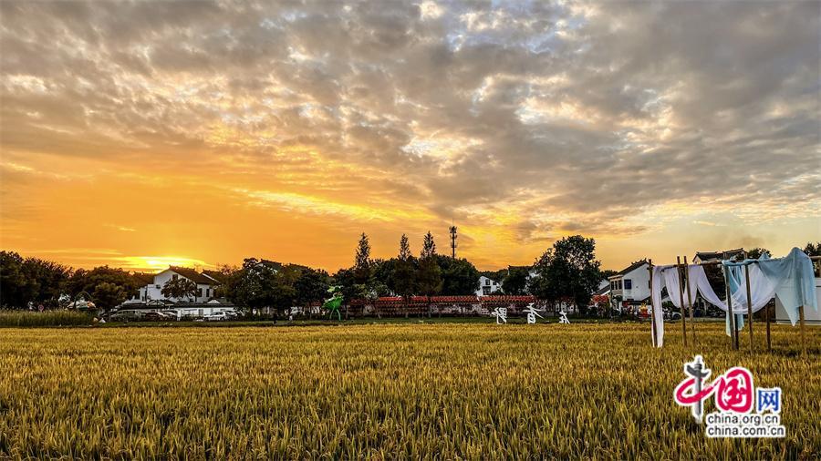 傍晚時(shí)分抵達(dá)香村,收獲了一場驚艷的落日美景,云層色彩在光線折射下不斷變化,忽而紅如火,忽而燦如金,忽而粉如煙,再到最后一抹落日的余暉撒遍整個(gè)村莊,稻田村舍,樹木小花,一切都籠罩在一片祥瑞的金光里,如夢似幻……這應(yīng)是我見到過的最美江南晚霞。