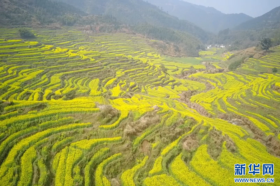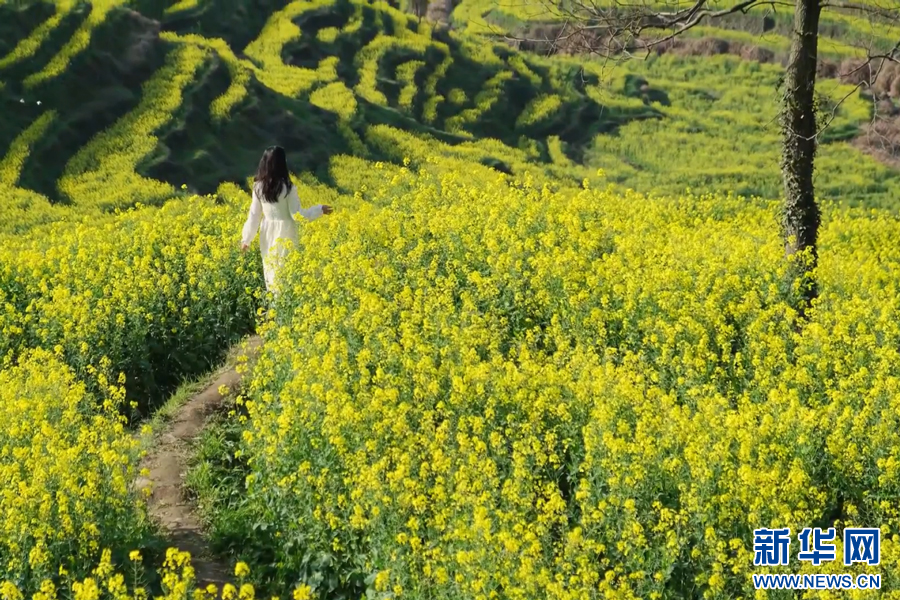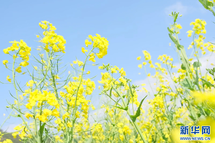 金黃的油菜花盛開(kāi)如海,花田內(nèi)一片金黃璀璨。新華網(wǎng)發(fā)