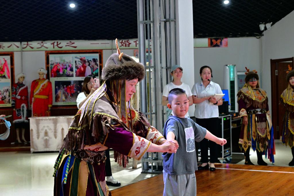 在展示館二樓活態(tài)展示區(qū),赫哲族演員頭戴鹿角帽,身穿民族服裝,跳起熱烈的“溫吉尼”舞蹈,為前來參觀的游客帶來一場神秘又震撼的視聽盛宴。表演結(jié)束后,游客還可以走上舞臺,和演員們學(xué)習(xí)薩滿舞的舞蹈動作,體驗(yàn)赫哲族古老的文化。