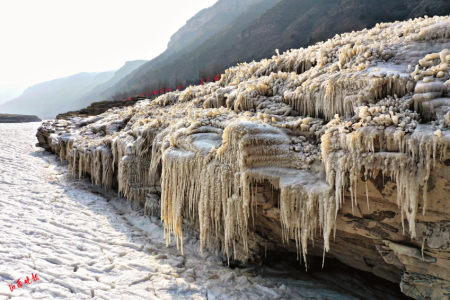 黃河壺口瀑布,往日奔騰咆哮的黃河水,像是被大自然施了魔法一般,飛濺的浪花和彌天水霧在兩岸巖石和護欄上迅速凝結(jié),形成了層層疊疊、形狀各異的冰掛。巨大的冰柱從河岸懸垂而下,宛如一座巨大的琉璃宮殿,又似一道天然的冰簾。河水拍打著冰層,發(fā)出震耳欲聾的咆哮聲,與飛瀑上空的彩虹交相輝映,展現(xiàn)出大自然的磅礴氣勢與壯美。