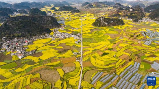 近日,貴州省六盤水市六枝特區(qū)木崗鎮(zhèn)的15000余畝油菜花競(jìng)相綻放。金黃的油菜花同田地、道路、民居構(gòu)成一幅幅美麗的春日畫卷。