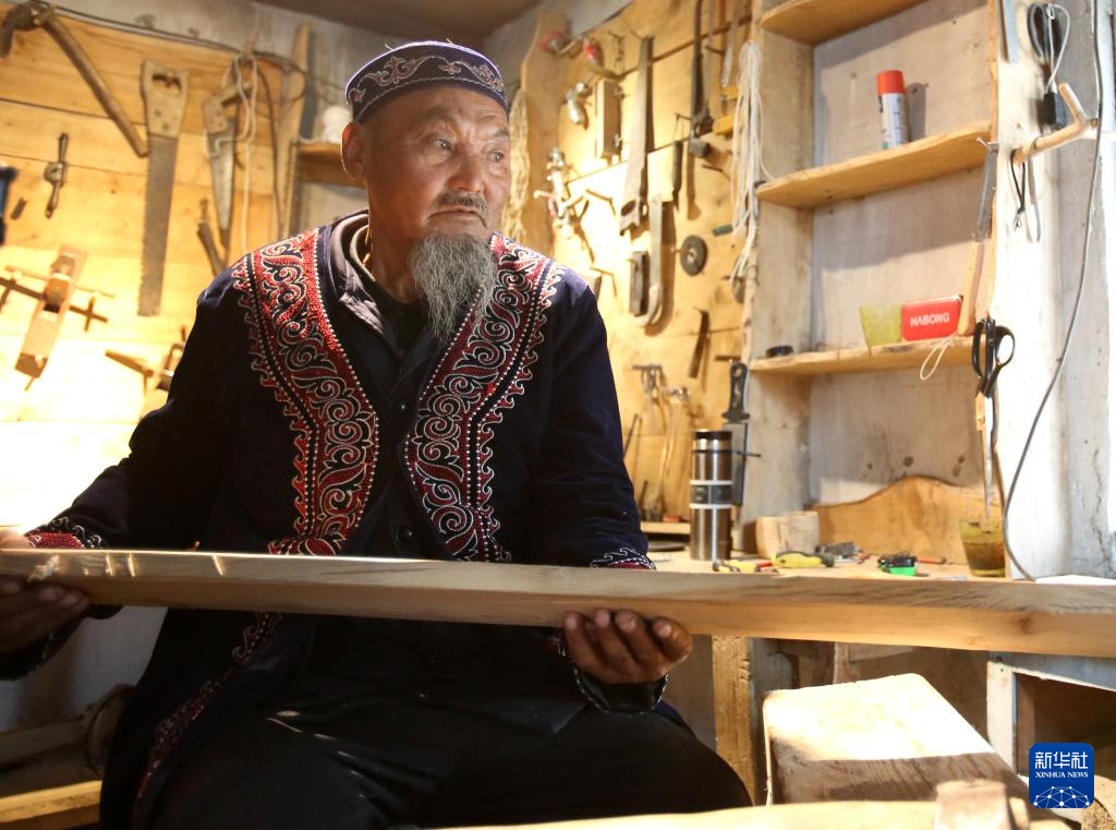 9月9日,在新疆阿勒泰“古老毛皮滑雪板制作技藝”傳習基地,斯蘭別克·沙和什制作毛皮滑雪板。